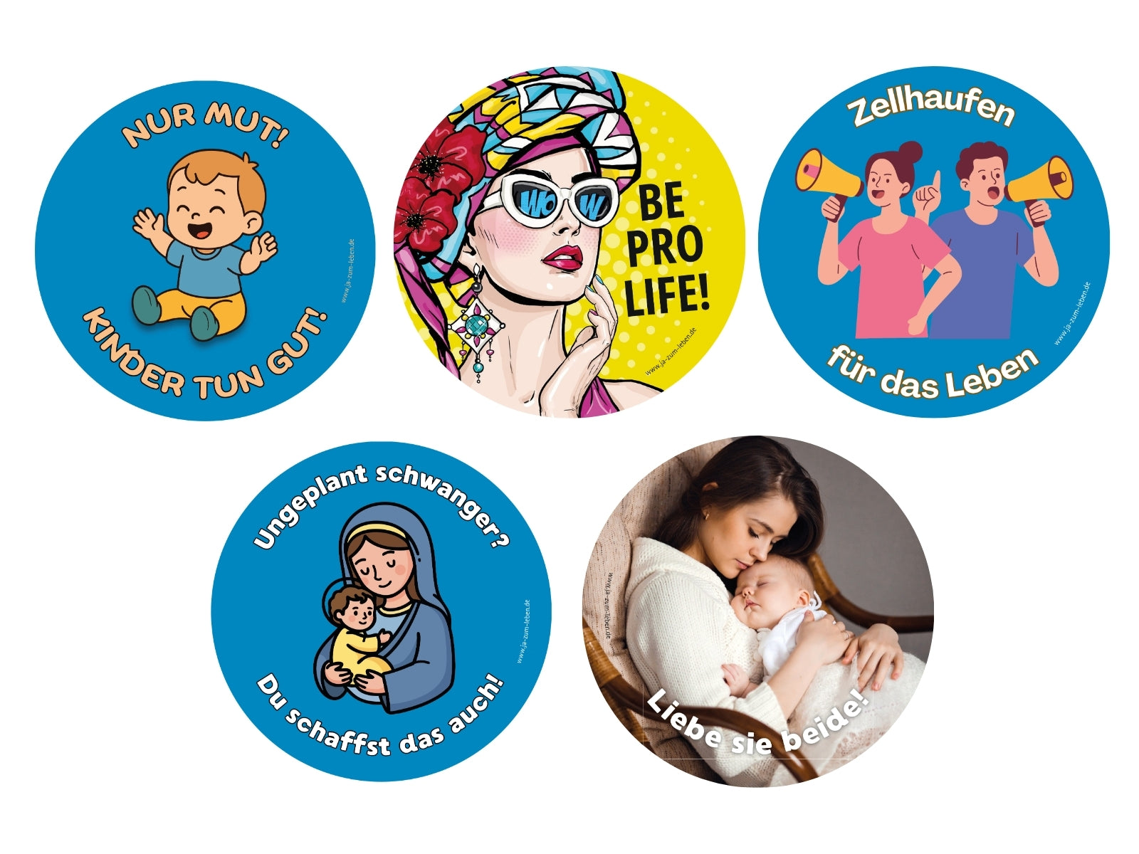 Egal ob auf dem Laptop oder dem Autoheck: mit unseren runden Stickern wird jeder zum Lebensbotschafter. Der Durchmesser beträgt 9,5 cm.